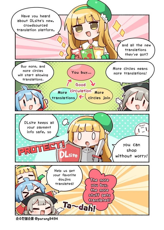 You can register for free, and translate any work that has been made available for the service. Remuneration is based on a percentage of sales for works, which is set by circles, or a flat commission fee set by DLsite for specific works. Submitted translations will be sold only after undergoing review by DLsite's native staff. Translators are required to agree to the terms and conditions and provide information on how to receive remuneration.